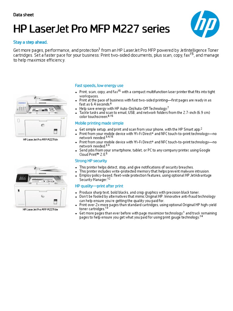 Hp m227fdw printup to 30 page/minute, input tray paper capacity up to 260 sheet, duty cycle up to 2,000 page/month.